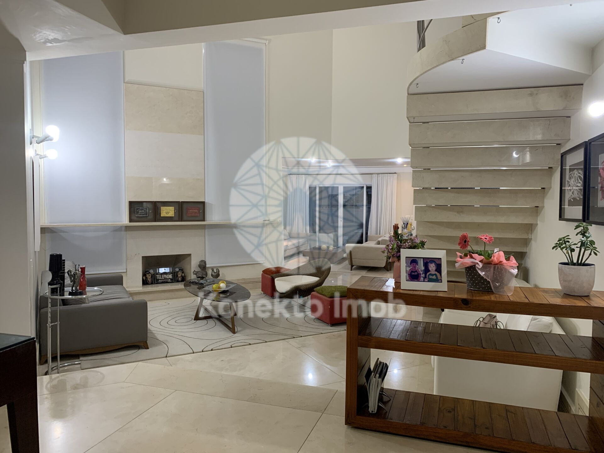 Pé direito duplo e uma escada imponente que leva ao pavimento superior.